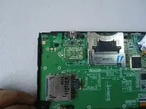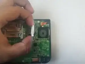 Пальцами аккуратно отсоедините маленькую зелёную прямоугольную плату (сетевая плата).