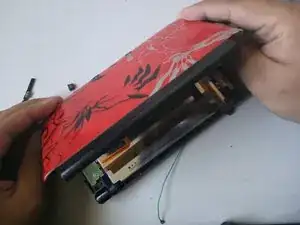 Осторожно снимите заднюю крышку под углом руками, оставив её соединённой с верхним краем и осторожно относясь к лентам.