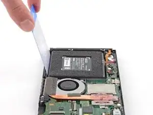 Осторожно зацепите кончик медиатора под батарею и проведите вдоль края, чтобы начать рассекать клей.