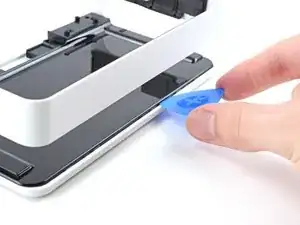 Проведите лопатку вдоль вертикального края нижней половины средней части корпуса, чтобы освободить пластиковые защёлки, фиксирующие её к передней крышке.