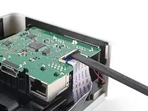 Используйте плоский конец лопатки, чтобы приподнять маленькую фиксирующую планку на ZIF-коннекторе кабеля материнской платы.