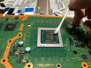 Нанесите 2–3 капли средства для удаления термопасты на ватные палочки и удалите старую термопасту, затем протрите микрофиброй до полной очистки от остатков пасты.