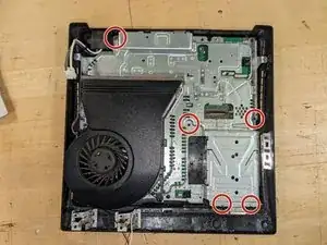 Снимите пять винтов Phillips #0 на кожухе материнской платы.