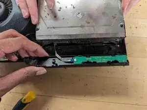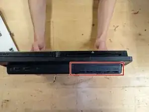 На панели с кнопками имеется кабель, который всё ещё подключён к консоли, поэтому её нельзя отодвинуть далеко. Пока что положите деталь вверх ногами, как показано на третьем изображении. Этот кабель подключается к разъёму под Blu-ray-приводом.