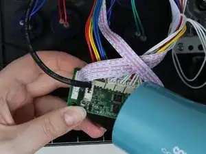 Используйте фен или тепловую пушку, чтобы размягчить клей, удерживающий USB-кабель в разъеме на печатной плате.