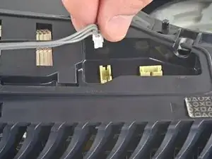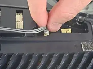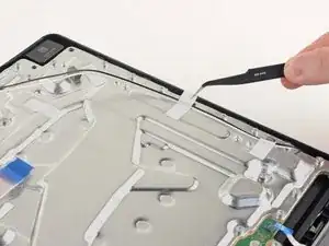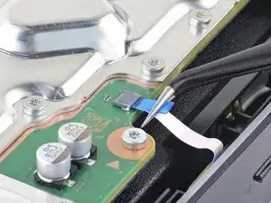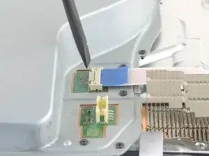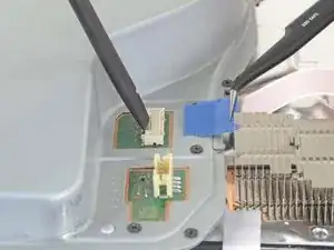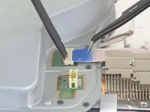 С помощью пинцета потяните синюю направляющую вкладку прямо от разъёма, чтобы отсоединить LED-шлейф.