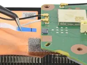 С помощью пинцета захватите белый провод антены Wi‑Fi у его металлической основы как можно ближе к разъёму.