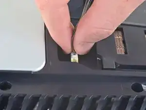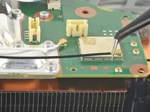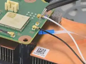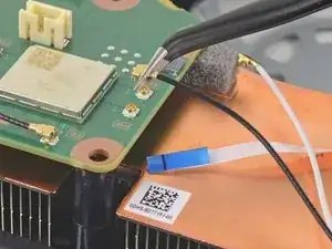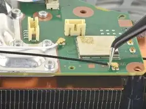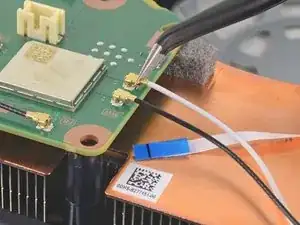 С помощью пинцета захватите чёрный или синий провод антенны блока питания у его металлической основы как можно ближе к разъёму.