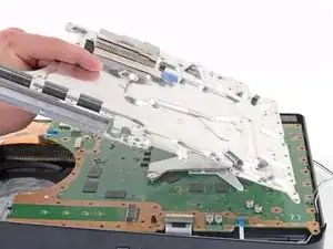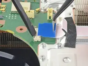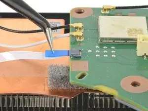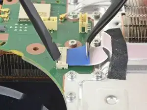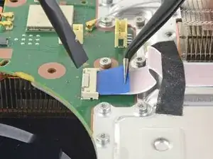 Удерживая металлическую заслонку в нажатом положении, с помощью пинцета потяните синюю направляющую вкладку прямо от разъёма, чтобы отсоединить кабель от материнской платы.