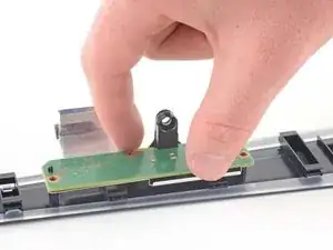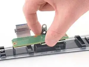 С помощью пинцета потяните синюю направляющую вкладку прямо от разъёма, чтобы отсоединить шлейф питания и кнопку извлечения.