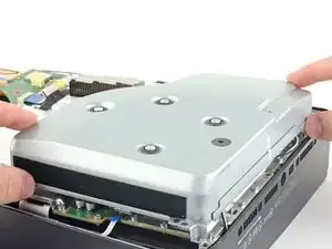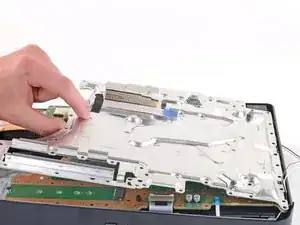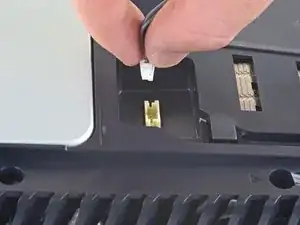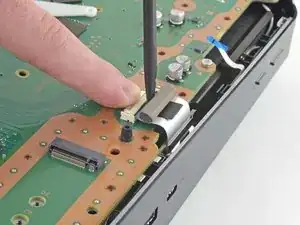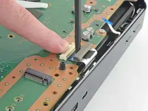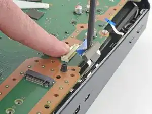 Удерживая металлическую заслонку в нажатом положении, с помощью пинцета потяните синюю направляющую вкладку прямо от разъёма, чтобы отсоединить кабель от оптического привода.