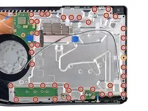 Используйте отвёртку Torx T8, чтобы удалить сорок два винта, закрепляющих верхнюю защитную пластину:
