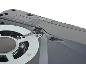 Вставьте плоский конец лопатки под чёрную крышку проводов и в зазор над проводами вентилятора.