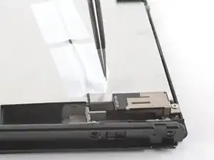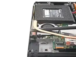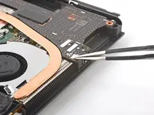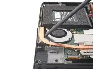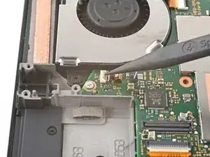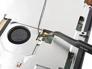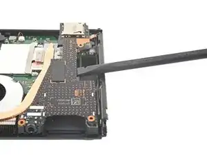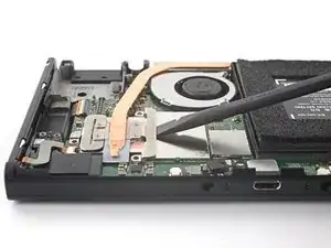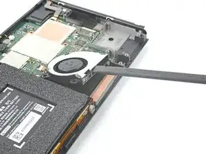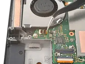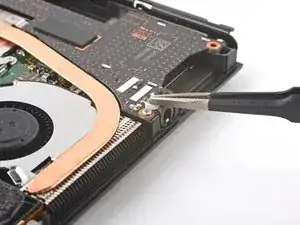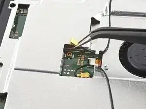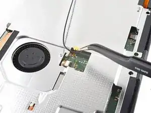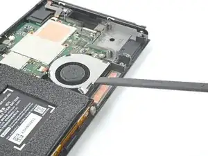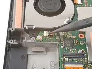 Используйте кончик лопатки, открывающий инструмент или ноготь, чтобы поднять маленький запирающий язычок на ZIF коннекторе кабеля вентилятора.