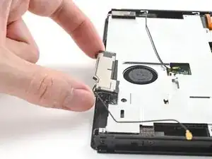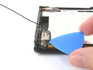 Используйте кончик лопатки, чтобы перенаправить коаксиальный кабель вторичной антенны Wi-Fi из его слота в корпусе.
