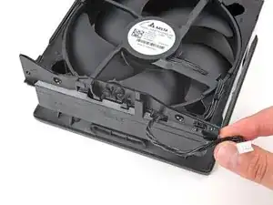 Используйте пальцы, чтобы полностью вывести кабель вентилятора из его канавок на скобе и протяните разъём через прямоугольный вырез.