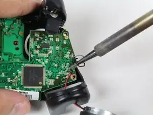 Выпаяйте паяные соединения, удерживая красный и чёрный провода прижатыми к верхней материнской плате.
