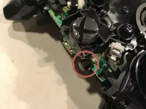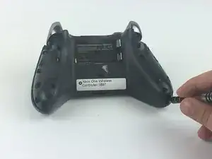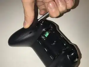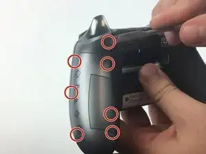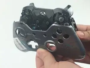 Верхние кнопки соединены средней пластиковой накладкой вокруг центральной кнопки Xbox. Снимите эту пластиковую деталь, приподняв её над двумя штырьками, нажав центральную кнопку и сдвинув накладку вверх.