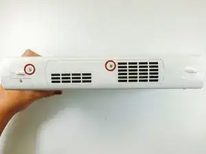 Положив консоль дном вверх, снимите следующие 6 винтов, скрытые под белыми квадратными наклейками: