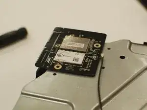 Удерживая чёрный разъём Wi‑Fi платы на месте вместе с крышкой, прикрутите его к металлической крышке, зафиксировав разъём.