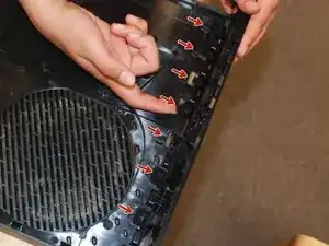 Чтобы отсоединить эту деталь, одновременно поднимите все перечисленные защёлки, затем наклоните деталь наружу и отведите — она должна освободиться; это трудный шаг и может потребоваться помощник.