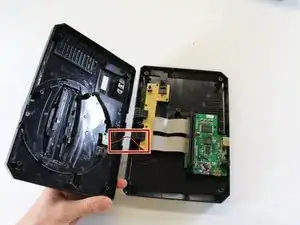 Положите одну руку на нижнюю панель корпуса, а другую на верхнюю панель. Аккуратно раздвиньте две панели, наклонив верхнюю панель в сторону передней части устройства. Рассматривайте переднюю часть устройства как петлю.