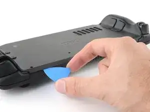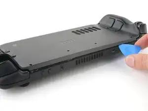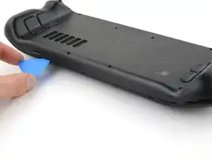 Если не удается вставить лопатку здесь, попробуйте вдоль верхних или нижних краев Steam Deck OLED перед тем, как скользнуть в сторону ручки.