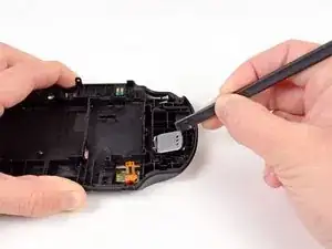 С помощью лопатки аккуратно отожмите и снимите фиксатор кабеля аккумулятора на сборке задней крышки.