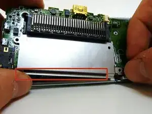 Когда язычок выйдет снизу, сдвиньте EMI-экран вниз и выньте из устройства.