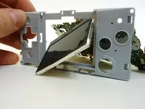 Чтобы вынуть ЖК-экран, осторожно поверните его под углом, чтобы он стал по диагонали относительно квадратного отверстия в пластиковой защите, и выдвиньте.