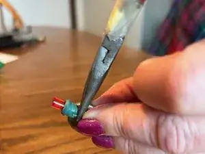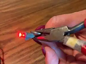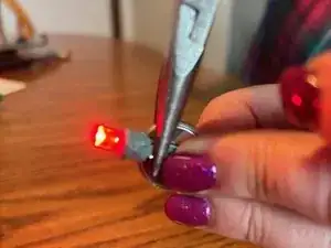 Проще: приложите одну сторону кнопочной батареи к одному выводу светодиода (все ещё в штекере), а другой вывод одновременно коснитесь металлическими плоскогубцами до другой стороны батареи. Плоскогубцы выполняют роль проводника, замыкая цепь. Если не сработало, попробуйте перевернуть батарею — светодиоды проводят ток только в одном направлении.