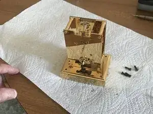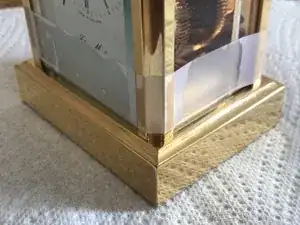 Переверните часы и отогните войлочное покрытие основания в каждом углу, чтобы открыть отверстия для винтов, крепящих четыре латунные стойки корпуса к основанию.