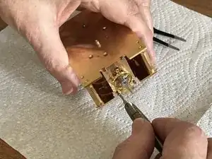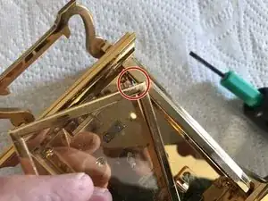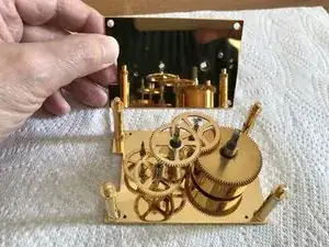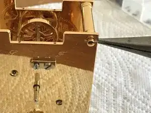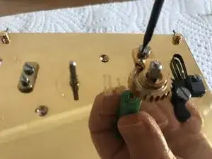 Ещё одна латунная пластина, закреплённая винтом, закрывает трещоточное колесо. Уберите и её.