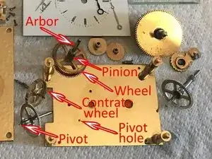 Большее зубчатое колесо называется колесом. Колесо часто зацепляется с шестернёй, образуя редукцию. Несколько таких вместе образуют зубчатую передачу, передающую энергию пружины на анкер и стрелки.