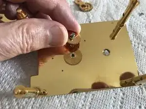 Осталось ещё два колеса, зафиксированных на передней пластине одним винтом. Они образуют редуктор между минутной и часовой стрелками. Выверните фиксирующий винт и снимите колёса.