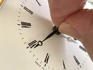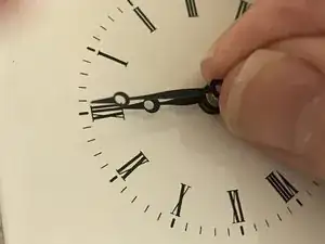 Сожмите минутную стрелку по обеим сторонам штифта, большим ногтем и ногтем другого пальца, и снимите её.