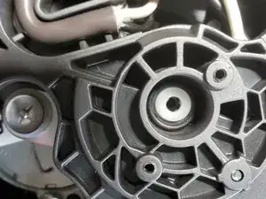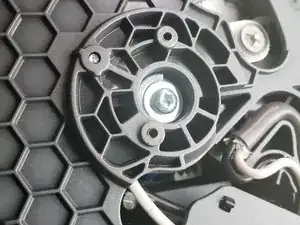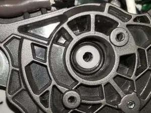 Открутите 8 винтов, снимите нижнюю крышку. Найдите предыдущий ремонт с двумя металлическими шайбами и удалите их. Установите чёрную резиновую прокладку снизу этой стопки и верните шайбы обратно. Помогает, но не полностью. Осталась ещё одна критичная причина шума: тонкое металлическое крепление за пластиковой перегородкой создаёт шум, и добраться до него непросто.