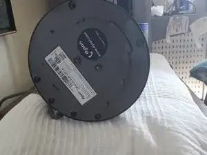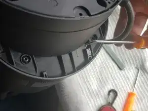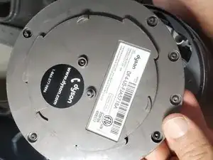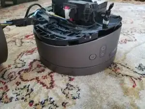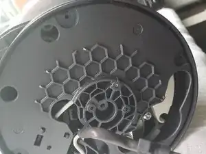 Переверните Дайсон вверх дном, нужно открутить 6 винтов. Если видны только 4, сдвиньте вентилятор в противоположную сторону, чтобы открылись ещё два с другой стороны.