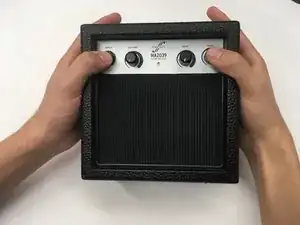 Разместите большие пальцы на гнезде входа и регуляторе тембра. Удерживая заднюю часть серебристого отсека остальными пальцами, сильно нажмите на серебристую панель, смещая её к задней части усилителя.