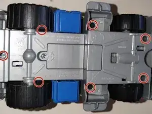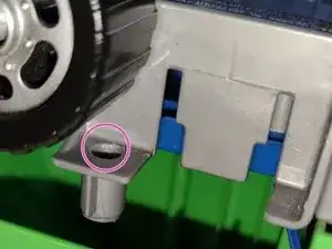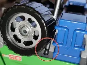 Два винта скрыты под задними колесами. Вам нужно подвести отвертку за колесо к отверстию для винта. Колеса не снимаются.