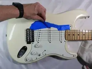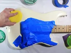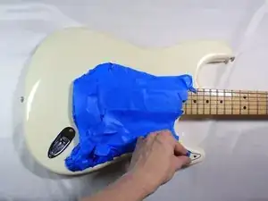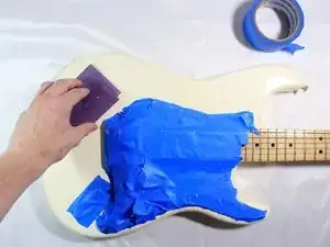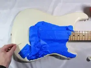 Завьте пластмассовые и металлические компоненты на корпусе гитары скотчем.