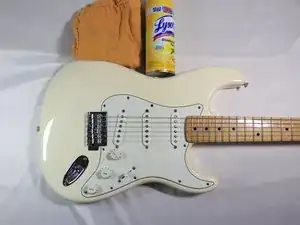Очистите корпус гитары универсальным чистящим средством и полотенцем из ткани.