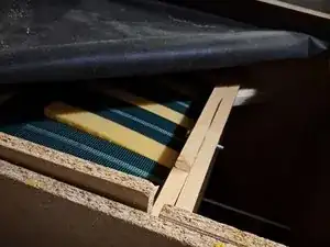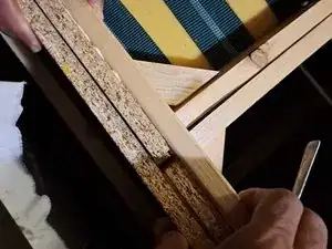 Удалите большой лист, покрывающий древесину в сиденьях дивана, чтобы выявить проблему, поскольку древесина — это то, что держит диван вместе.