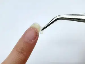 Осторожно прижмите прямоугольник пинцетом, чтобы сделать его плоским на ногте.