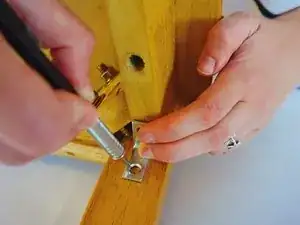 Установите уголок так, чтобы он укреплял ножку к каркасу стула.