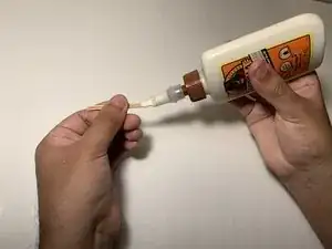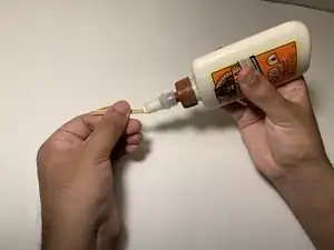 Далее покройте клеем для дерева ту часть зубочистки(ок), которая будет заполнять отверстие для винта.