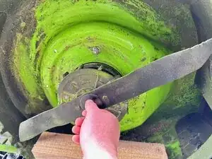 Лезвие газонокосилки будет стремиться вращаться против часовой стрелки. Поместите правильный край лезвия против деревянного бруска, чтобы избежать ненужного вращения лезвия.