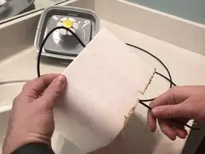 Отсоедините провод, прикреплённый к насосу, чтобы освободить его от фонтанчика, вынув вилку шнура из сетевого адаптера. Затем возьмите конец провода и протолкните его через открытое отверстие.