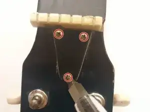 Прикрутите крышку анкерного стержня к головке грифа гитары с помощью 2 винтов 1/4" с крестообразным шлицем и отвертки Phillips 0.