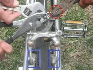 На этом изображении мы используем плоскогубцы и регулируемый ключ вместо 9-миллиметровых ключей, которые были бы идеальны для этого болта. Тем не менее, все, что может зажимать и поворачивать болт, вполне подойдет.